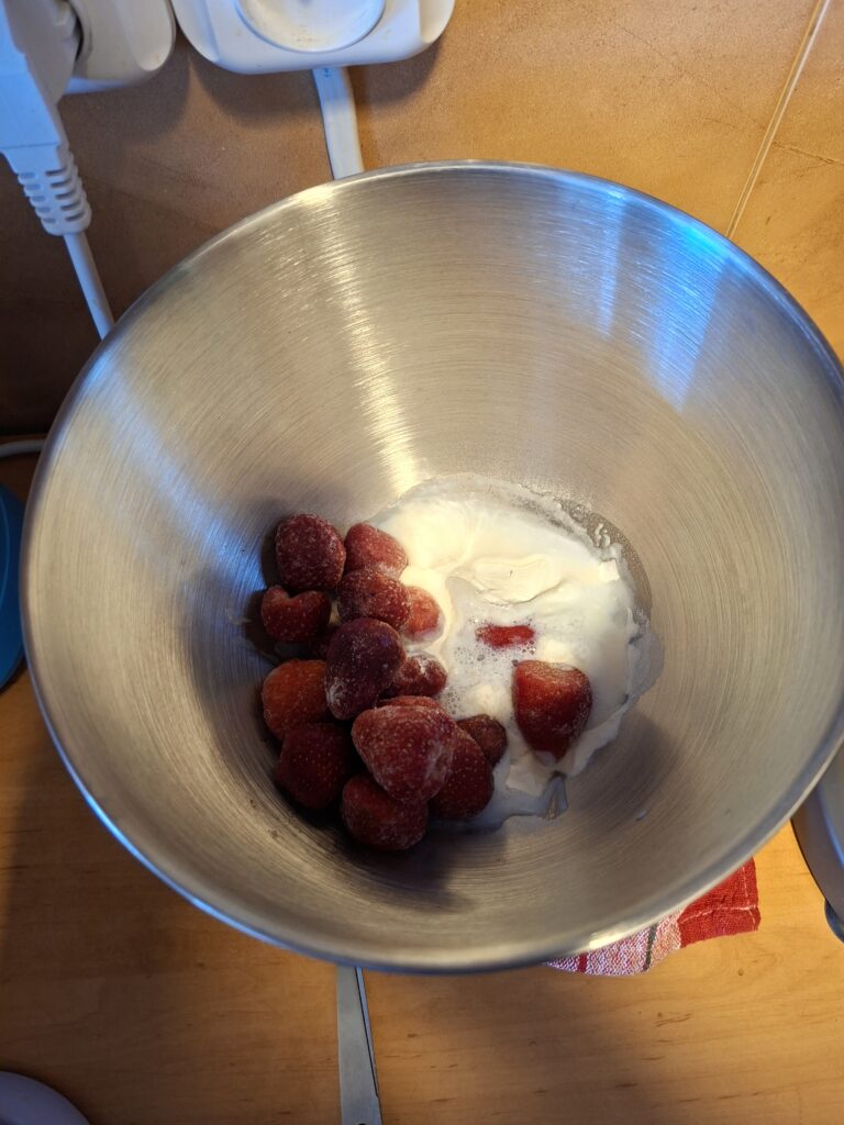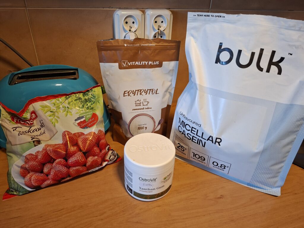 - 250g owoców, wg uznania – mogą być mrożone truskawki, borówki, miksy owocowe, myślę że banan też może smakować w porządku.