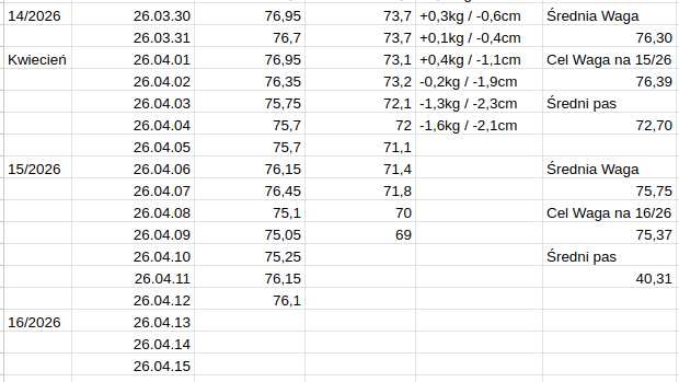 Tydzień 15 zamykam z wynikiem znacznie do przodu w stosunku do założeń, aczkolwiek nie bez skutków ubocznych. Strasznie ucierpiały ciągi w związku z niską podażą kalorii, straciłem jakieś 20kg wyniku w rdlu.
